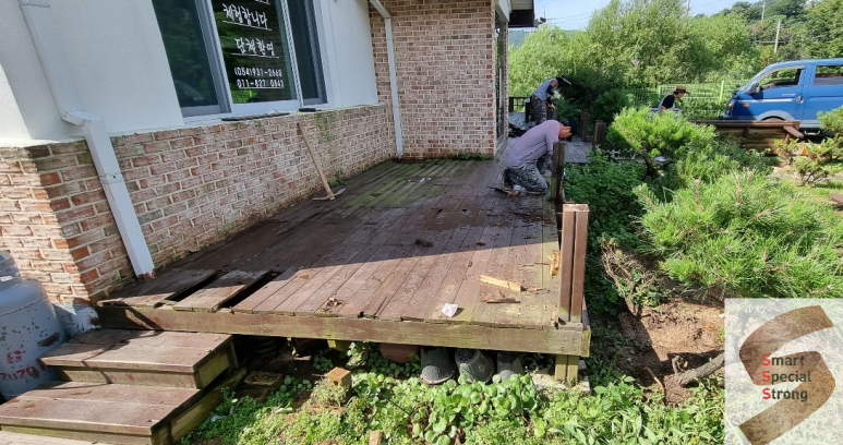 오늘 현장은 지난번 경북 성주군 대표 농가맛집 밀 오래된 방부목 데크 현장에 이어 철거 진행 현장입니다.