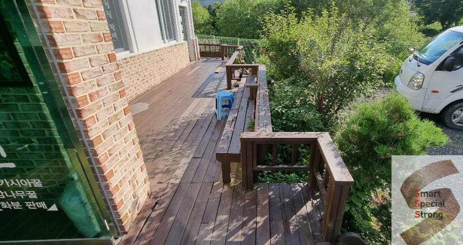 장마 기간이라 비가 올 때 데크의 색상이 더 돋보여지고 분위기 또한 다르네요^^