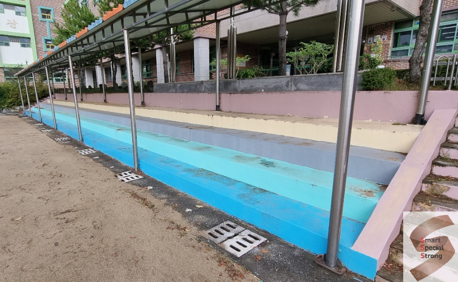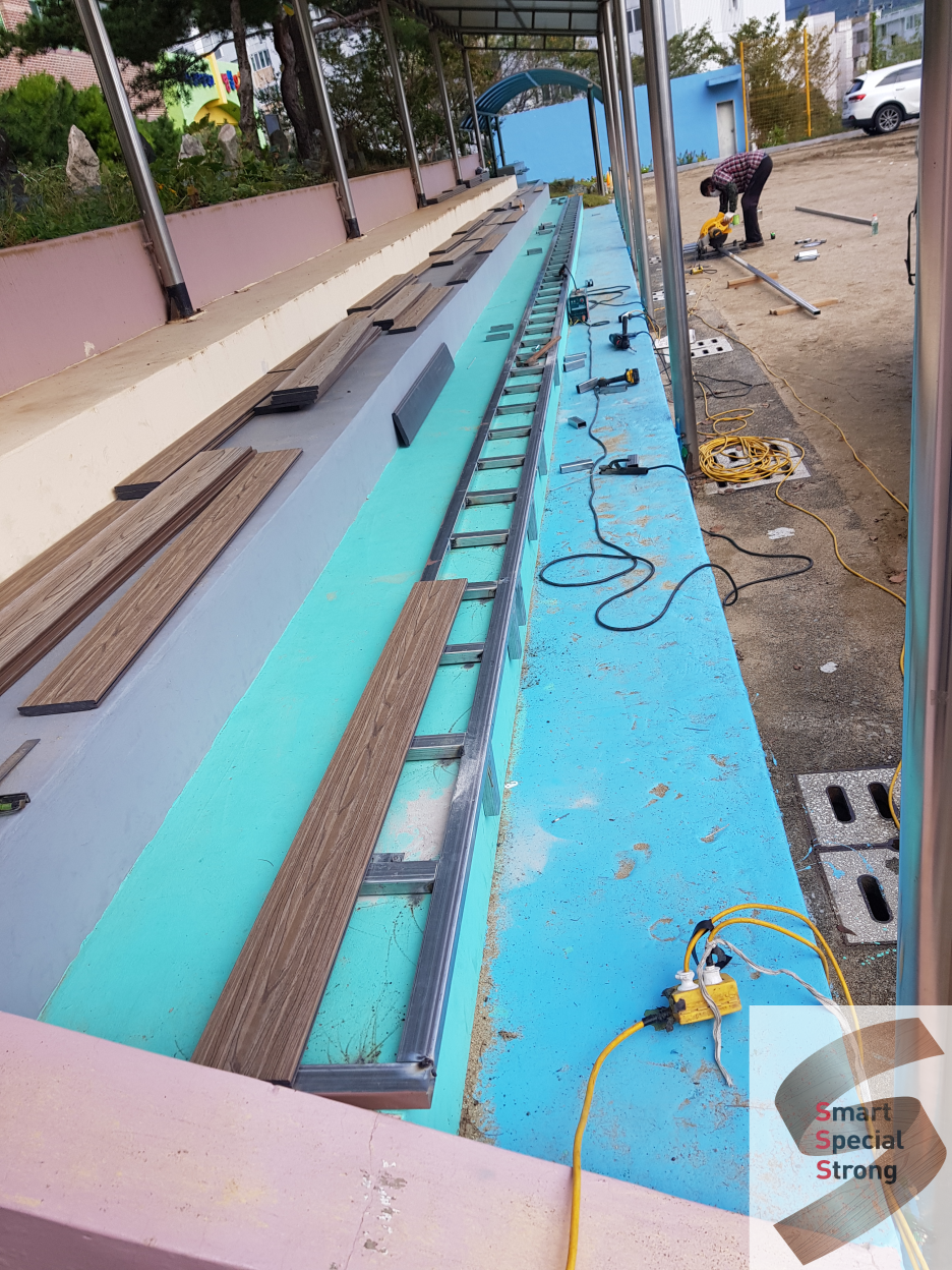 오늘은 대구 OO 초등학교 운동장 스탠드 계단 미네랄데크(합성데크) 시공 현장입니다.