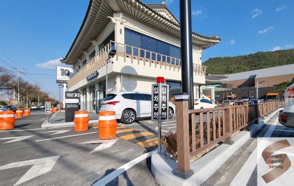 실내 이용 시 전용 주차공간과 드라이브스루를 위한 두 개의 차로가 있습니다.