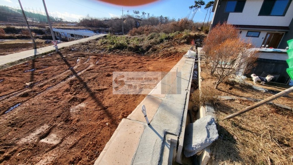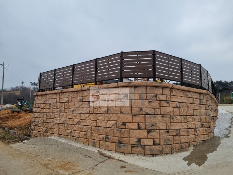 타설이 완료된 보강토 블럭 위