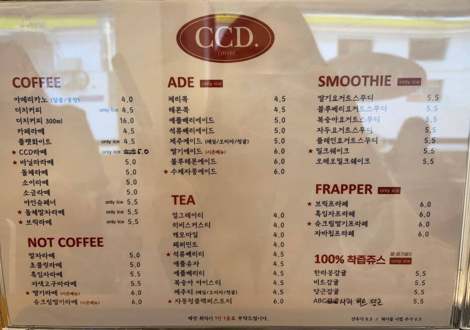 메뉴판이에용 ! 시그니처 메뉴는 CCD라떼라고 하셨는데