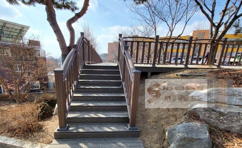 미네랄데크와 합성목재 울타리가 학교와 잘 어우러지는 모습입니다.