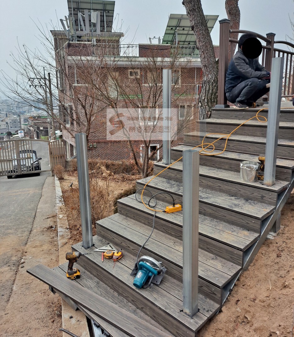 미네랄데크 상판 작업의 마무리와 동시에, 합성목재 울타리 시공 작업에 돌입합니다!