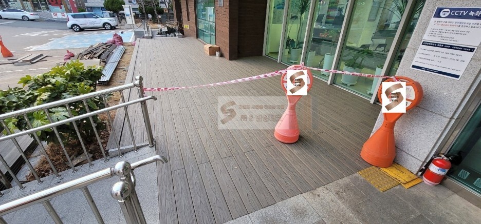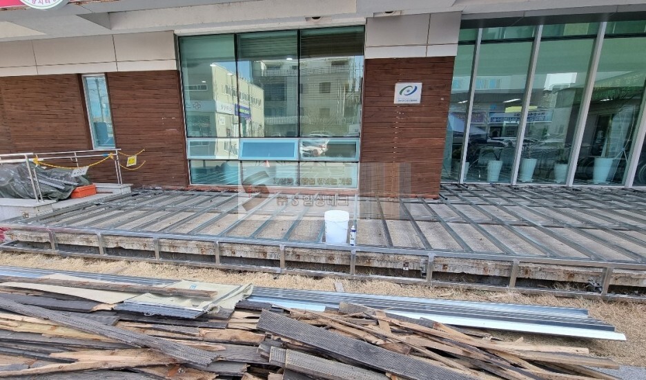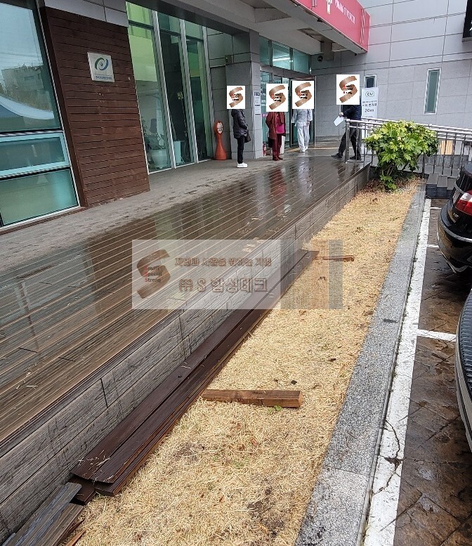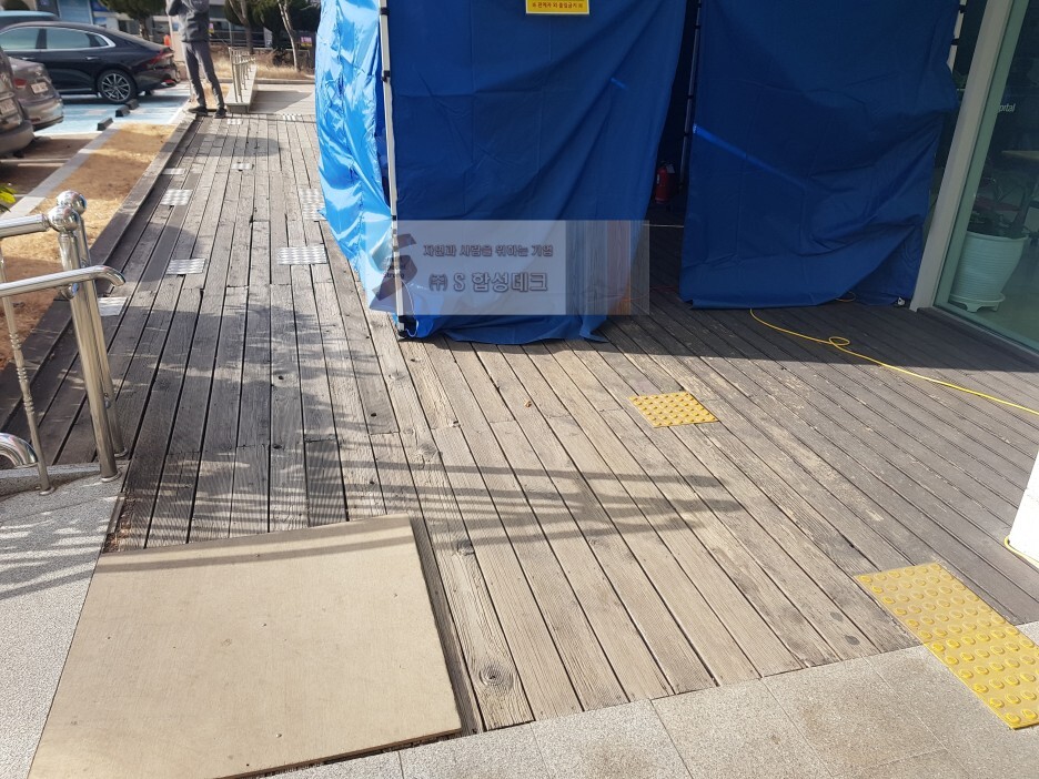 먼저 병원 입구 옆 기존 방부목 데크 현장입니다.