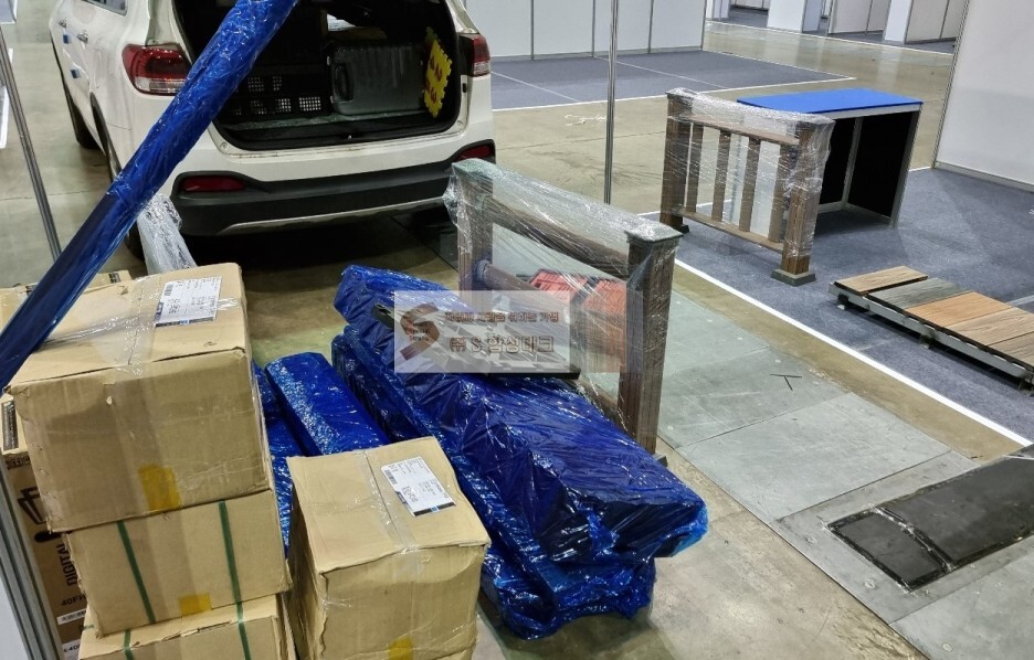 바리바리 싸온 디스플레이 제품들을 하나 둘씩 꺼내어 부스 세팅에 돌입 하였습니다.