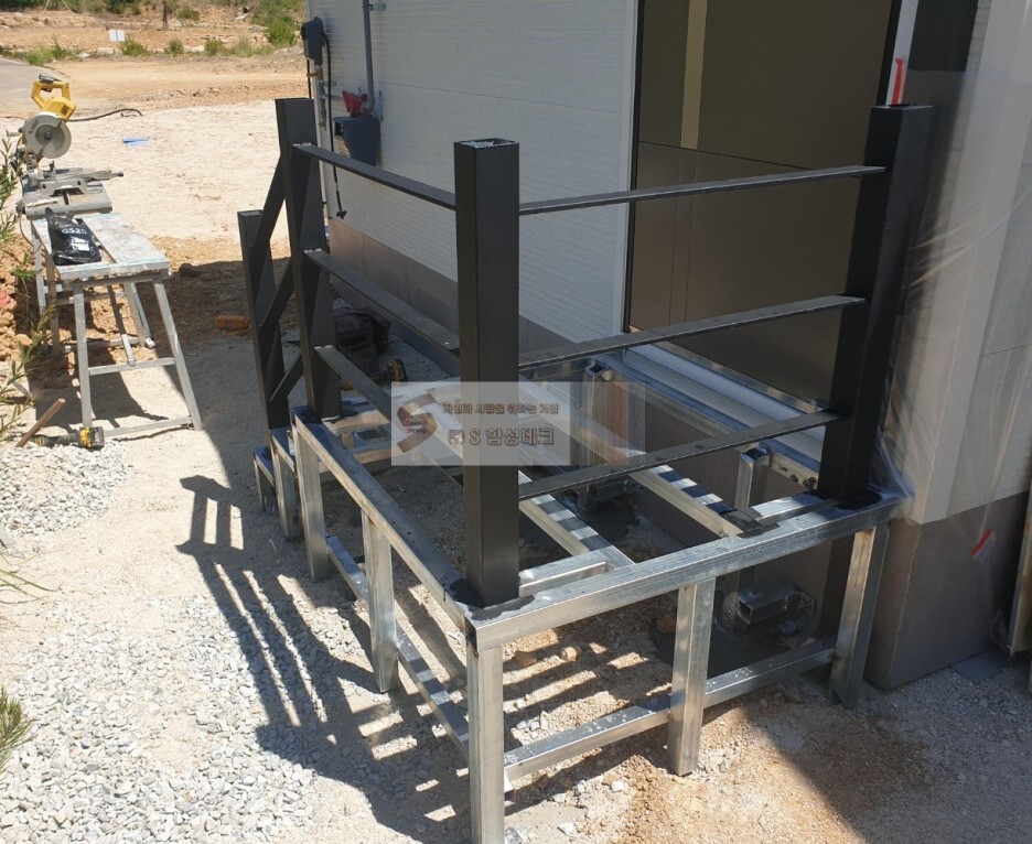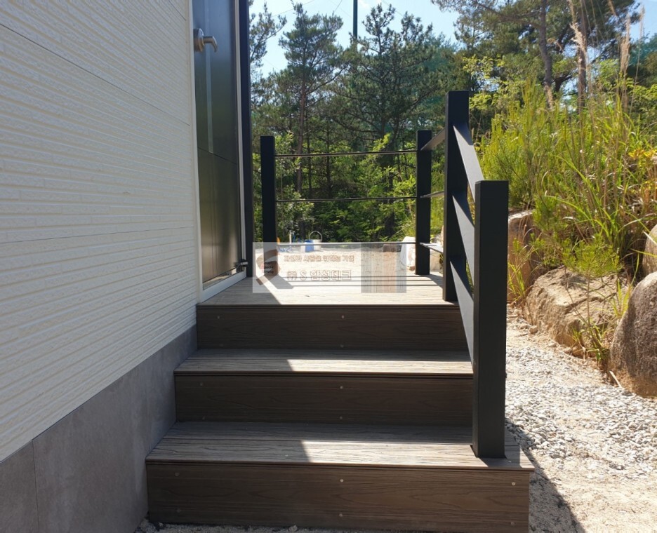후문 계단도 기초 하지작업을 끝내고, 데크 상판 작업 직전 난간대를 흑색 도장 작업하였습니다.