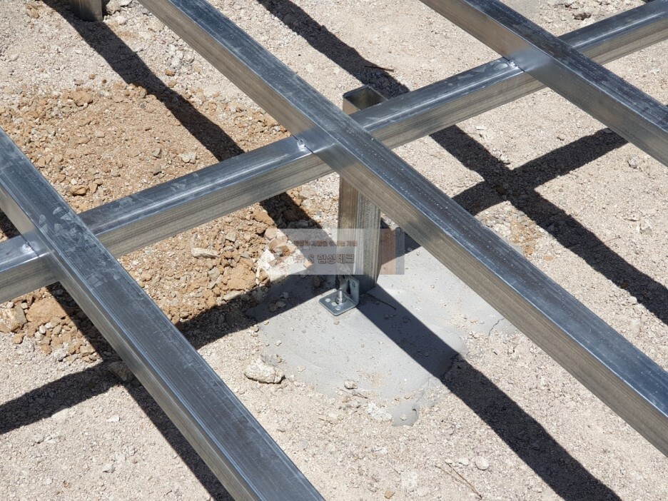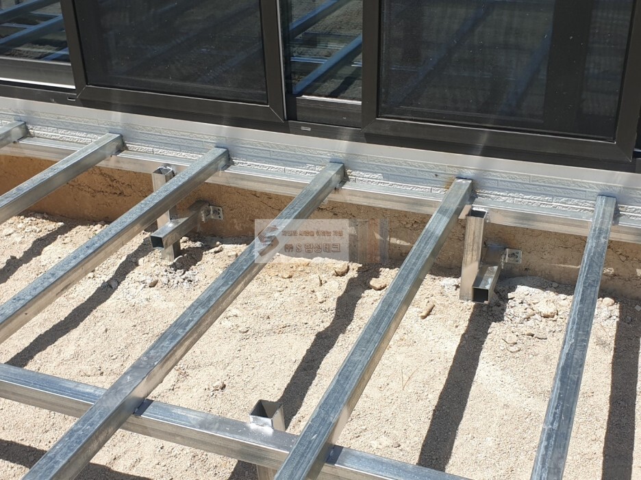 몰탈 부분과 벽면을 이용하여 아연도각관으로 이루어진 데크하지를 고정한 모습입니다.