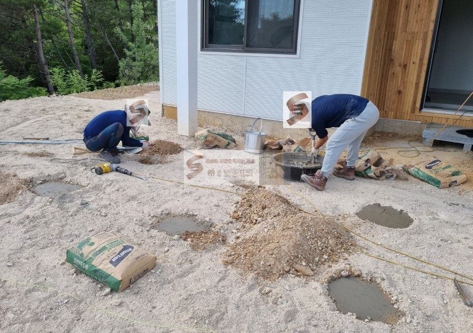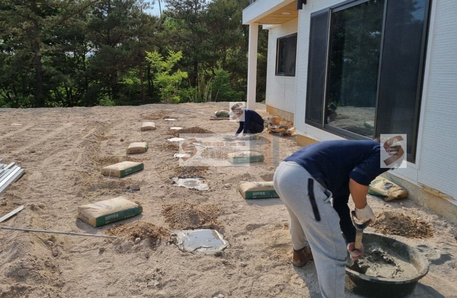 신축 현장이라 마당의 흙이 단단하지 않기 때문에 사전 기초 작업은 필수!