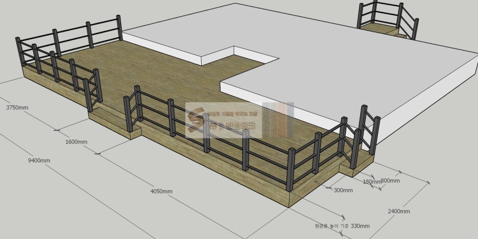 테라스 데크에 정면과 우측으로 출입구를 내고 안전난간대는 각관과 평철을 이용하여 제작!