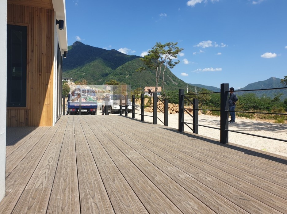 산으로 둘러싸인 한적한 전원주택에 '미네랄데크' WB(우드브라운) 색상의 테라스가