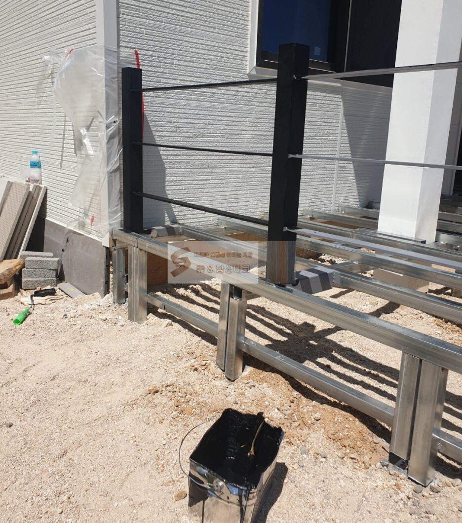 수평 레벨링 작업까지 된 데크 하지위로 안전난간대의 기둥들도