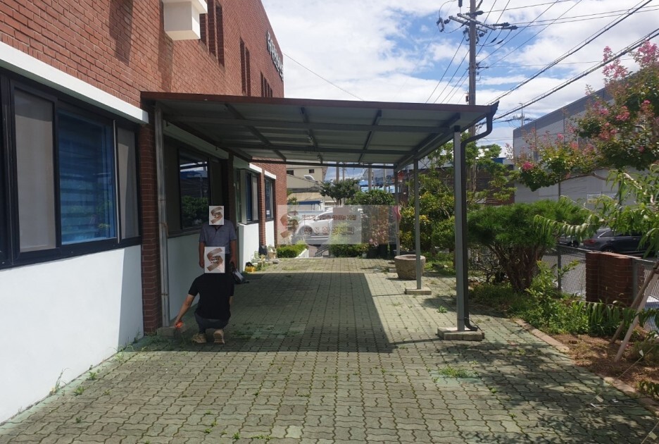 사무실 뒷편 출입문 앞으로 캐노피 지붕이 들어서 있는 공간입니다.