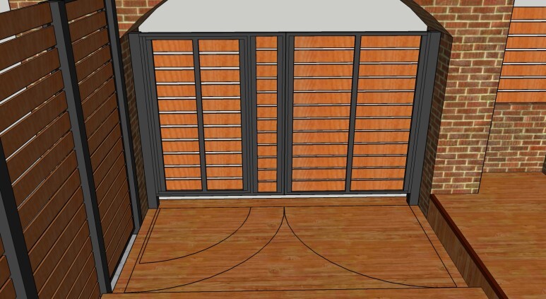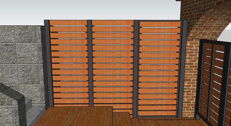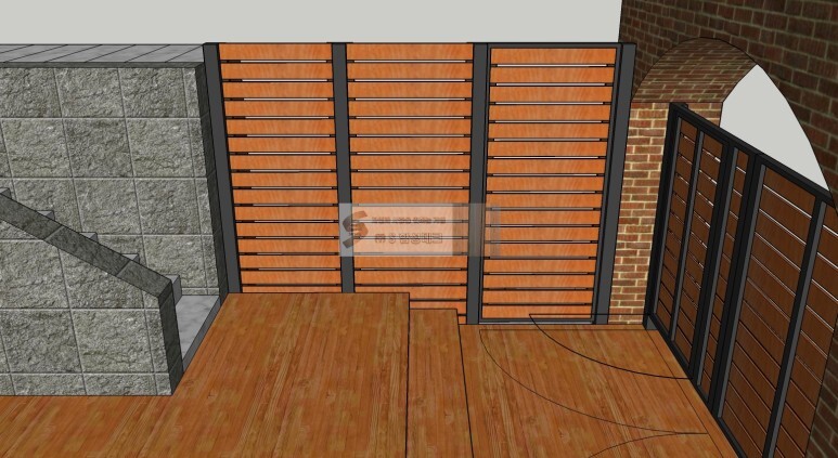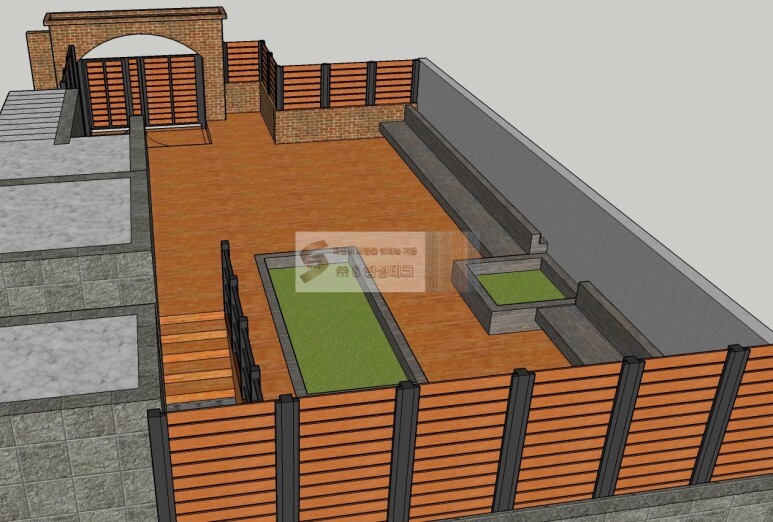 데크 바닥과 계단, 담장 위 휀스, 외부와의 경계/창고 가림을 위한 가림막, 대문 등