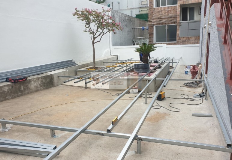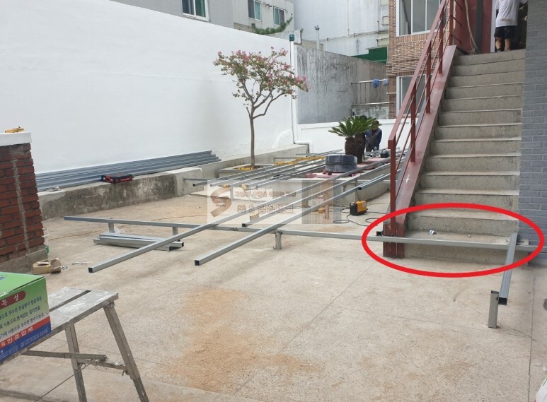 바닥에서부터 고정함과 동시에 데크하지, 담벼락과도 함께 잡아주어