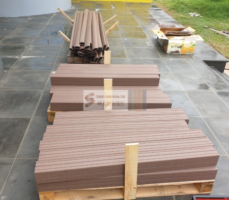 데크 위 난간으로 자주 설치했던 합성목재 웉타리 였는데,
