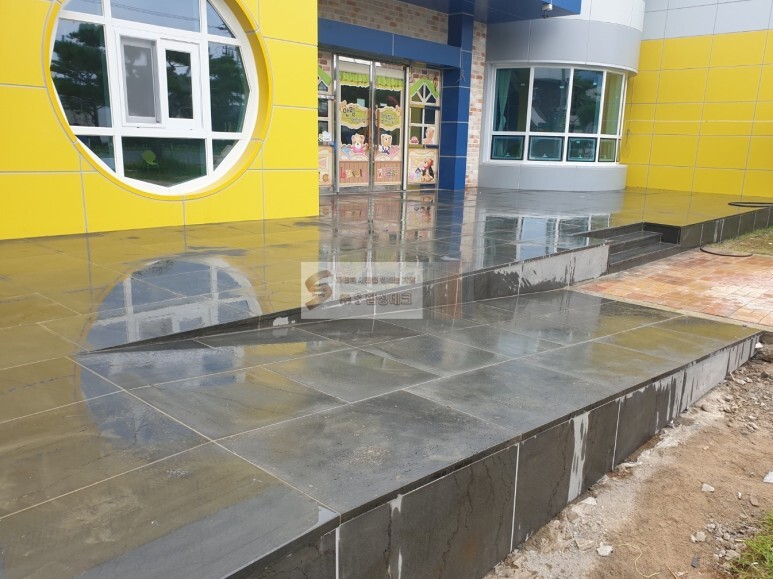 계획된 석재타일로 테라스 바닥과 램프(경사로) 구간이 모두 마감되었습니다.