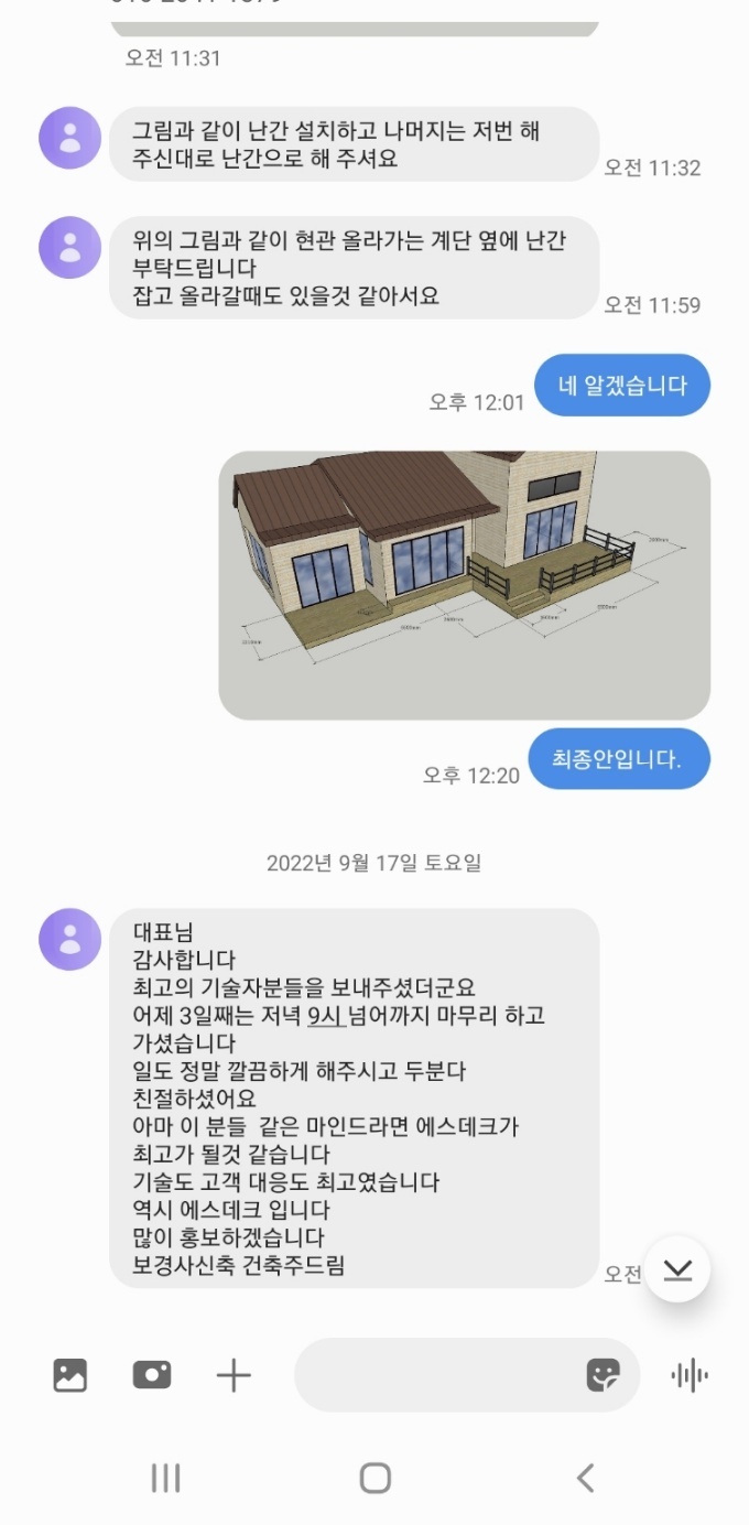 끝으로 건축주께서 시공 후 저희 대표님께 공사 후