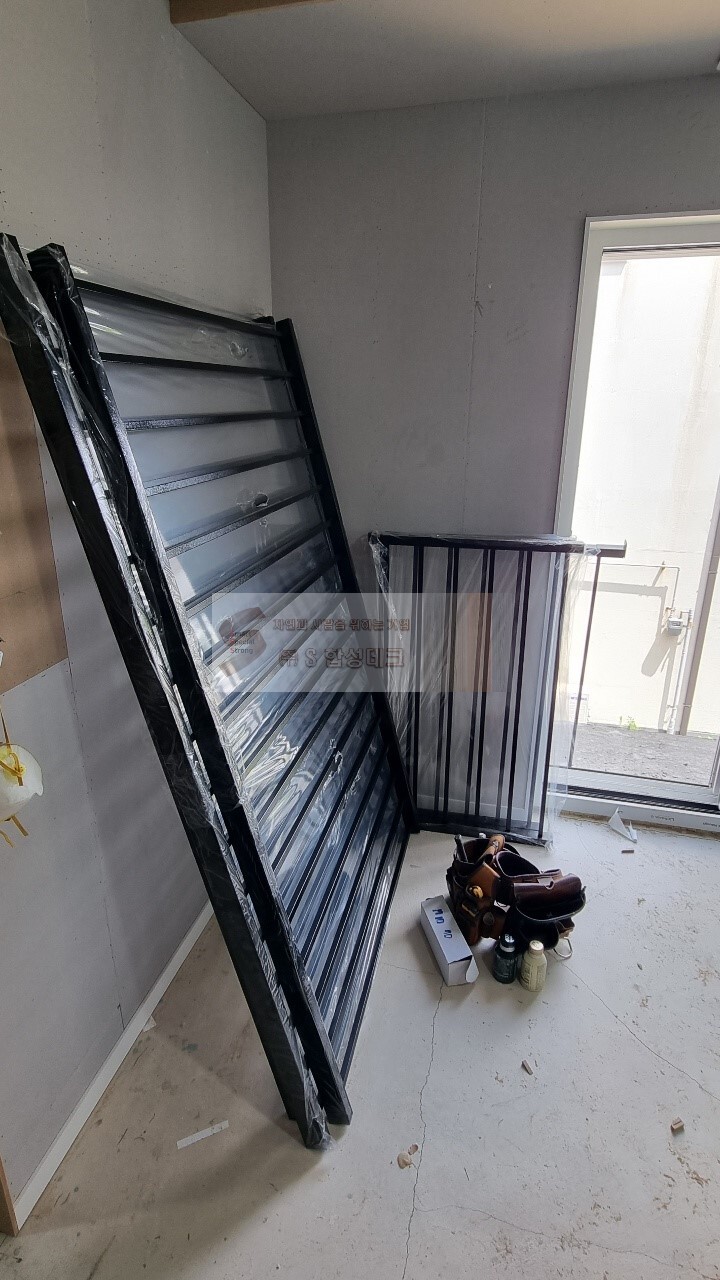 기둥을 바닥 앙카작업 -> 가로대와 중간 세로 판재를 체결해줍니다.