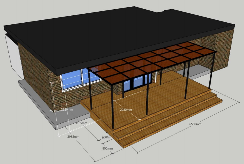 요청하신 대략적인 데크와 캐노피 시공 후 모습입니다.